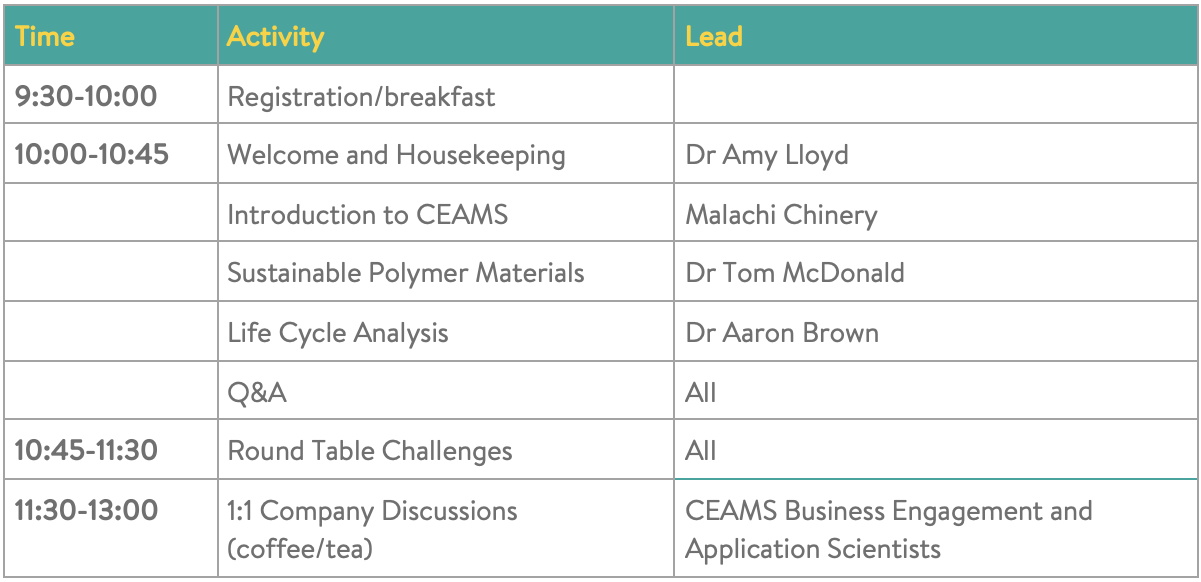 All attendees will receive a dedicated 1:1 session with a CEAMS Application Scientist. These confidential sessions offer free, tailored advice to help you address your own research and development challenges in sustainable materials, drawing on extensive sectoral expertise.