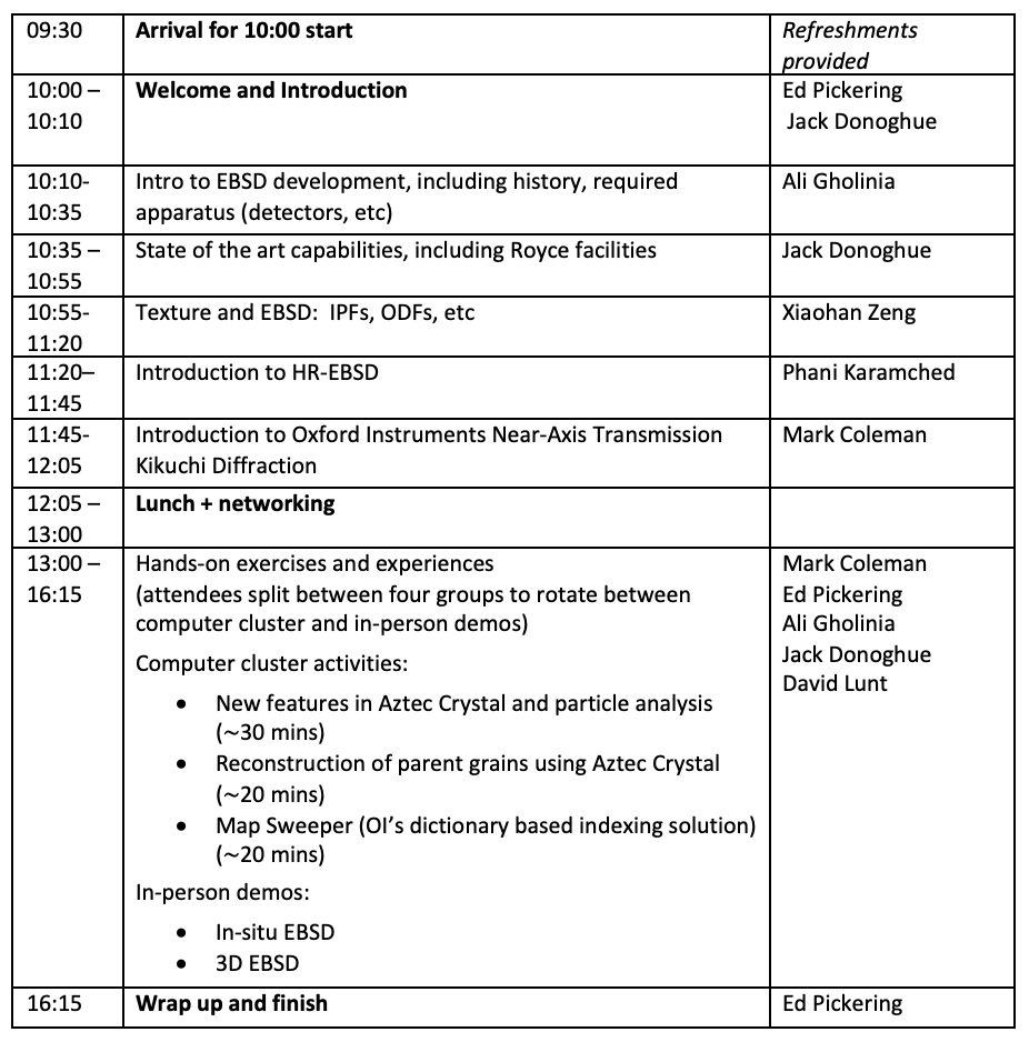 It will also provide an overview of the state-of-the-art facilities hosted by Royce at The University of Manchester, and other kit located with Royce partners. Routes to accessing Royce EBSD facilities will also be highlighted.