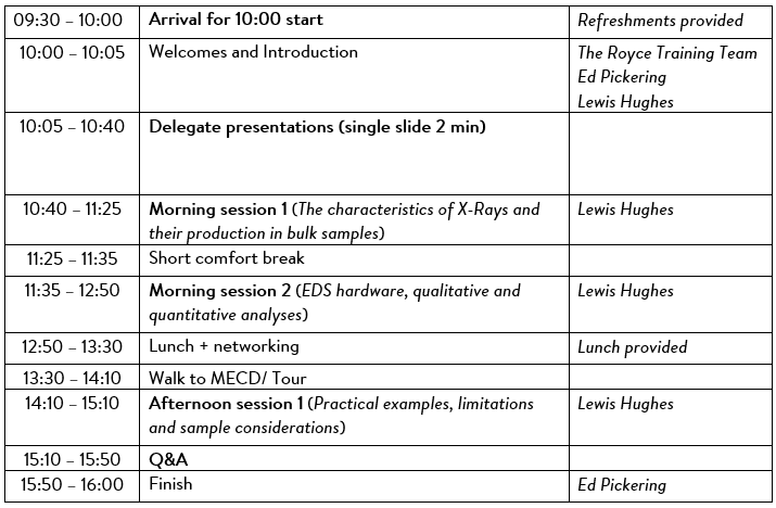 The content will introduce the concepts for the generation of X-rays for alloy analysis and EDS techniques on bulk samples. Participants will cover experimental procedures, quantification methods, sample preparation and analysis artefacts. The course aims to develop understanding and guidance for practical experimentation to ensure the collection of high-quality EDS data.