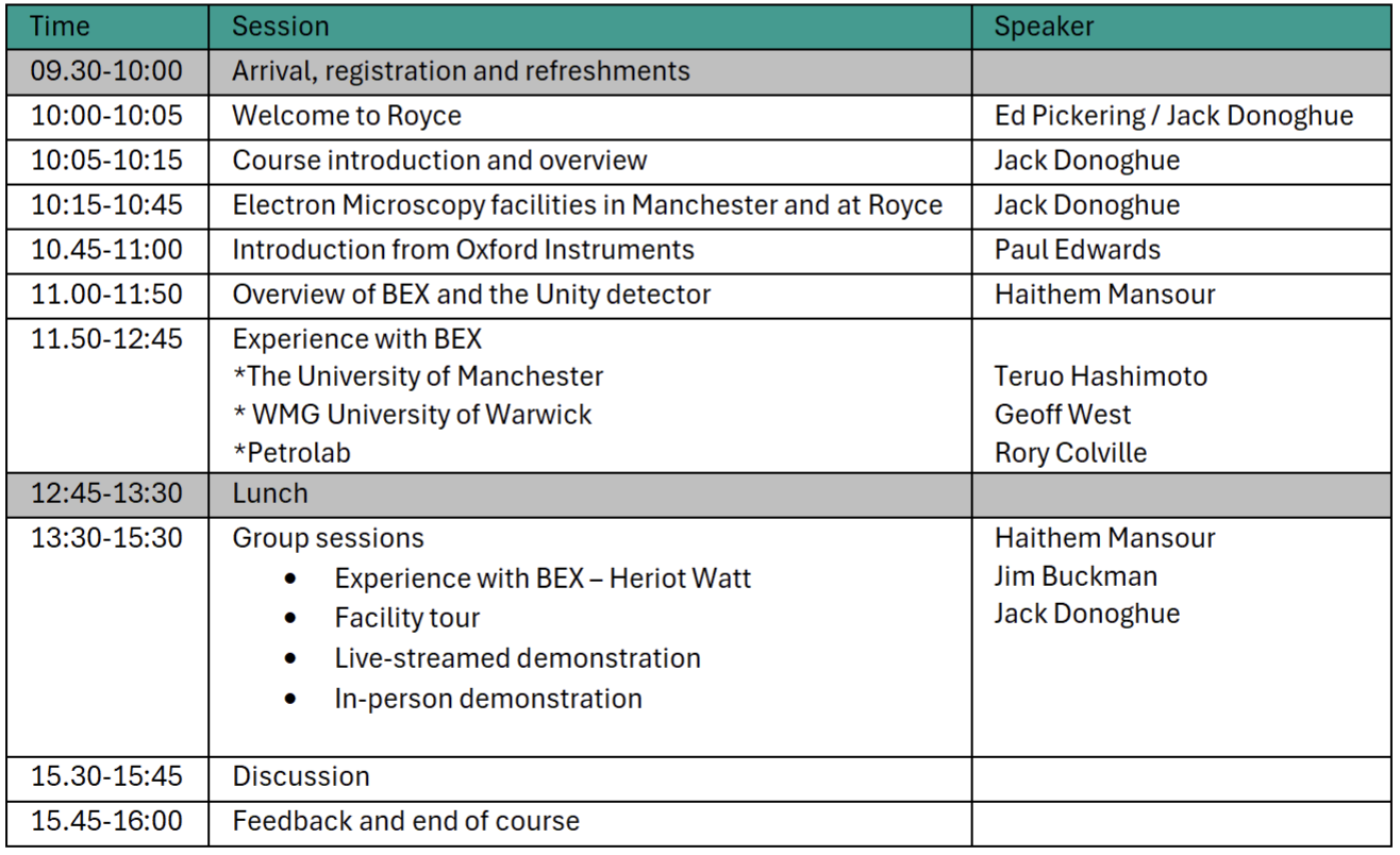 This course will introduce BEX, a new analytical technique for scanning electron microscopes. The content will explore how the technique combines data from two imaging techniques to give topographic, crystallographic, atomic number and elemental information. Research case studies will provide examples of successful BEX application in the identification and characterisation of materials, demonstrating potential novel uses of the technique to participants.