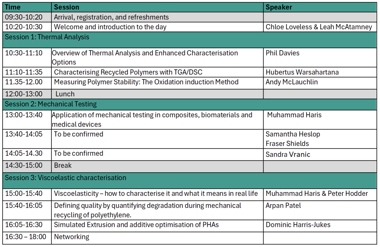 This event is suitable for industry partners and academic researchers interested in material and mechanical evaluation for polymers to biomaterials. Participants at all levels of expertise are welcome; whether encountering these techniques for the first time, sharing their own knowledge and use of these techniques, or contributing to discussions around how they can be optimised or applied in novel ways.