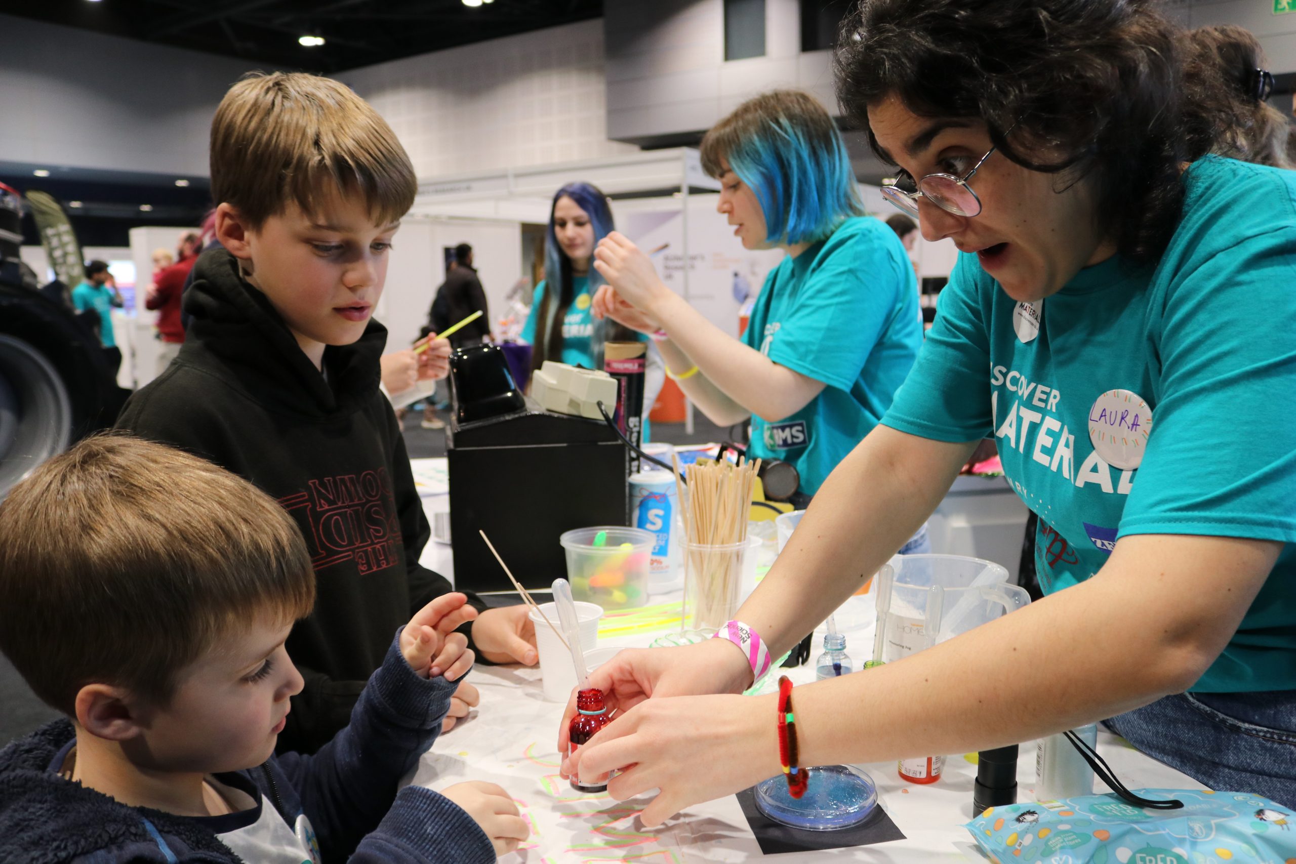 The Royce x Discover Materials event space at NSL Manchester hosted additional activities and experiments including slime making, a laser maze, an atomic ball-pool and badge making to engage younger attendees and showcase the range of disciplines which Materials Science covers.